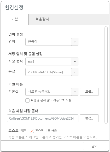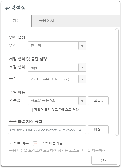 3. 자세한 녹음 설정은 상단 환경설정 아이콘을 클릭 시 생성되는 환경설정 창에 설정할 수 있습니다.