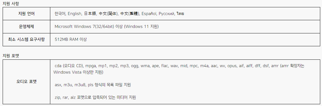 곰오디오를 이용하기 위한 제품 사양 안내입니다. 운영체제는 Windows 7/11 이며, 지원 포맷 등 상세한 내역은 아래 표를 참고하시기 바랍니다.