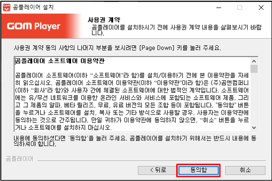 1. 곰플레이어 설치 팝업에서 [다음]을 클릭하고 사용권 계약에서 [동의함] 을 클릭합니다.