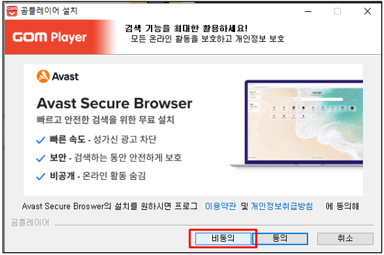 3. Avast 도 [비동의] 클릭하고, 시큐어커넥션도 [비동의] 를 클릭합니다.