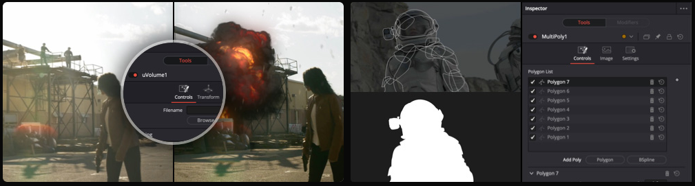 새로운 MultiPoly 도구는 사용자의 모든 마스크를 하나의 목록으로 보여주기 때문에 노드 간 전환할 필요가 없어 더욱 빠르고 정확한 로토스코핑이 가능합니다. 이는 복잡한 프로젝트에 적합하며, 한 곳에서 특정 모양을 확인/선택/추가/수정하고, 모양의 화면 표시를 전환하거나 파라미터를 조절할 수 있습니다.