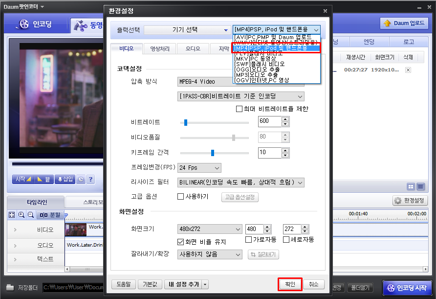 9. 영상의 확장자를 선택하고 [확인]을 클릭합니다.