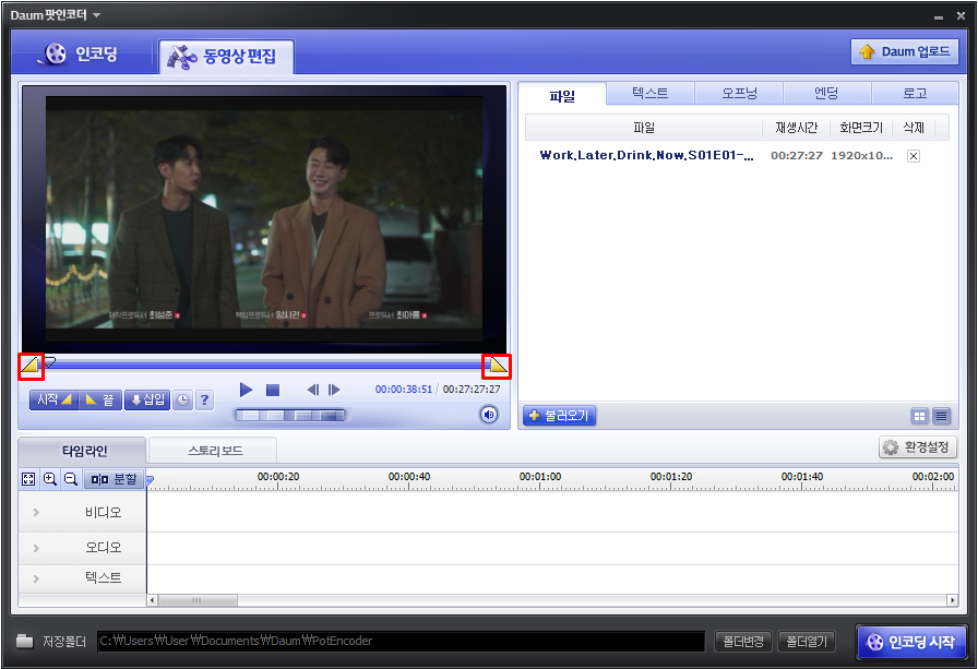다음팟 인코더에서는 동영상 자르기를 손쉽게 할 수 있습니다. 영상에서 특정부분만 잘라서 사용하는 기능입니다. 아래와 같이 따라만 하시면 됩니다.