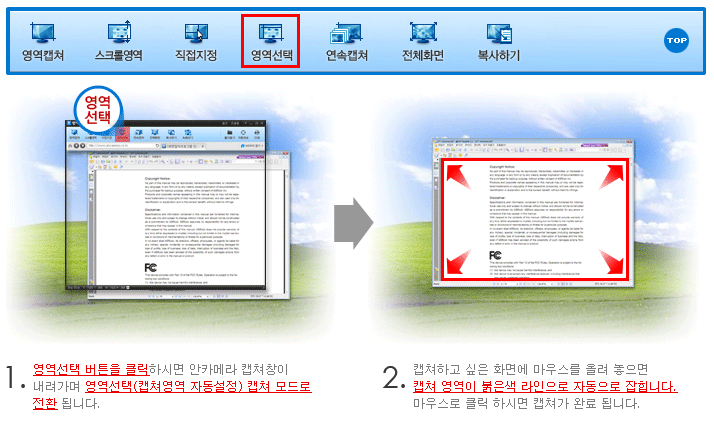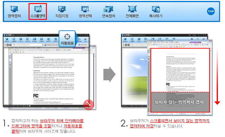 1) 영역선택 버튼을 클릭하시면 안카메라 캡쳐창이 내려가며 영역선택(캡쳥영역 자동설정) 캡쳐 모드로 전환됩니다.