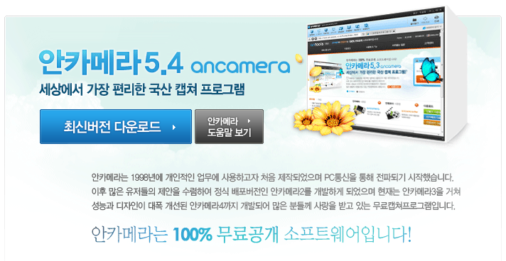 안카메라는 세상에서 가장 편리한 국산 캡쳐 무료 프로그램입니다. 직관적인 인터페이스로 많은 분들에게 사랑 받아온 프로그램입니다. 영역캡쳐, 스크롤캡쳐, 직접지정, 연속캡쳐 등 다양한 기능을 제공합니다.