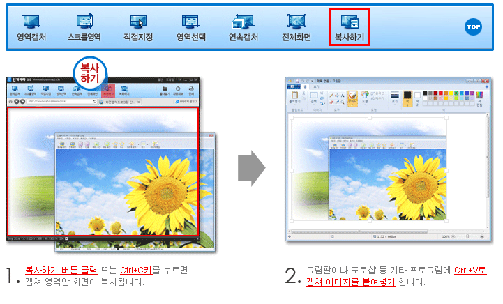 1) 복사하기 버튼 클릭 또는 Ctrl+C키를 누르면 캡쳐 영역안 화면이 복사됩니다.