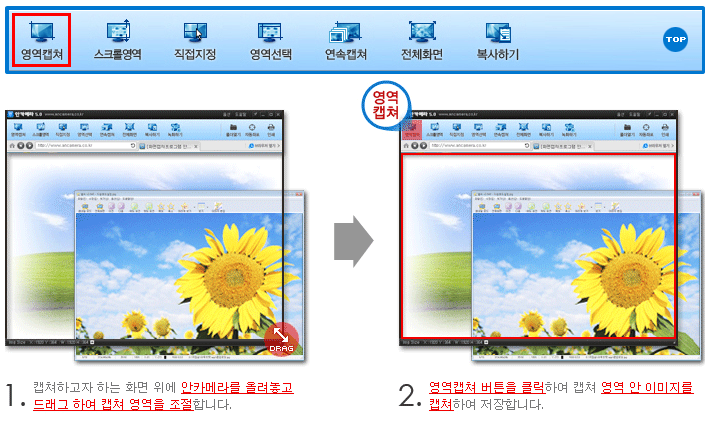 2) 영역캡쳐 버튼을 클릭하여 캡쳐 영역 안 이미지를 캡쳐하여 저장합니다.