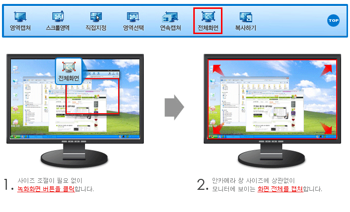 2) 안카메라 창 사이즈에 상관없이 모니터에 보이는 화면 전체를 캡쳐합니다.