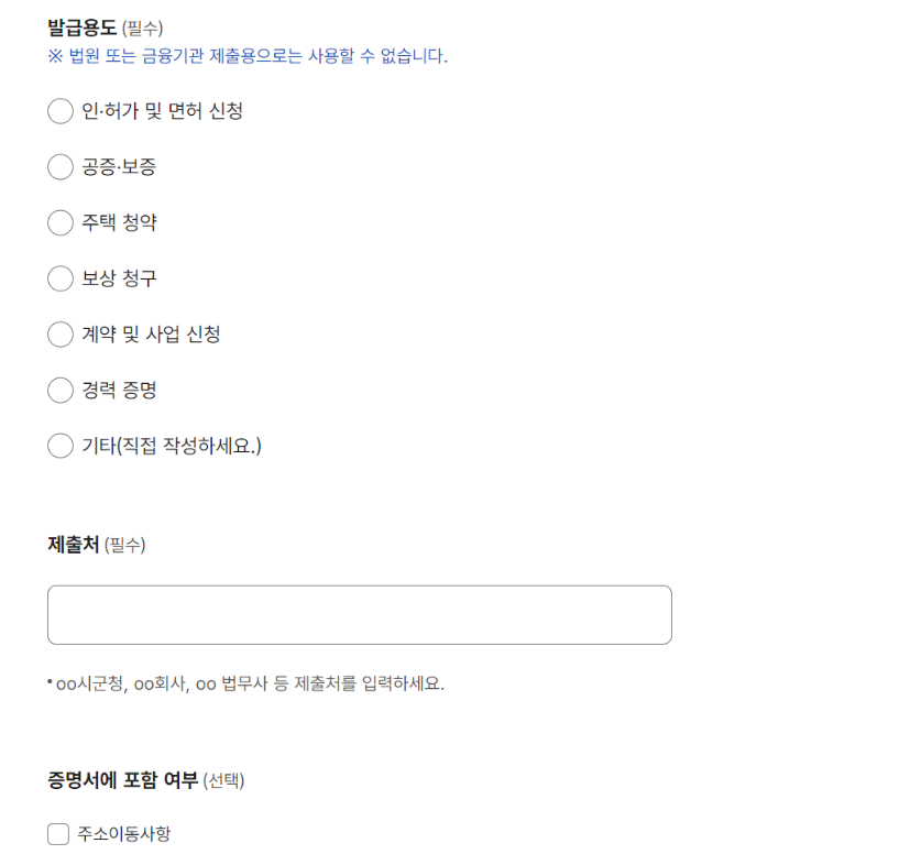 ④ 발급 용도, 제출처 등 추가 내용을 입력합니다.