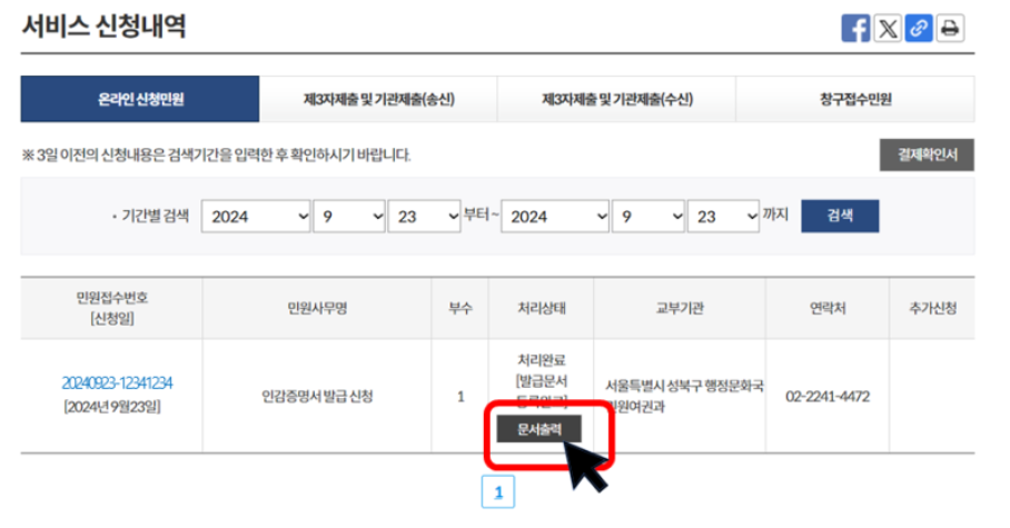 ② 리스트에서 신청하신 내역을 확인하신 후 ‘출력’을 클릭하시면 증명서를 출력하실 수 있습니다.
