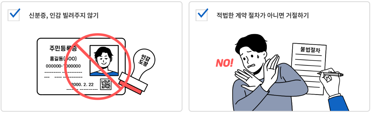 지난 2016년, 명의도용으로 대출금을 가로챈 사기꾼 최모 씨의 범행이 드러났어요. 최 씨는 급전이 필요하지만 일반 대출이 어려운 사람들에게 접근해, “가짜 전세계약서로 금리가 낮은 전세자금 대출을 받아주겠다”고 했어요. 정부 지원 전세대출 상품은 전세계약서를 내고 대출 신청만 하면 신용등급이 낮아도 무담보 전세대출을 받을 수 있다는 사실을 악용한 거죠. 이런 수법으로 최 씨는 은행 18곳에서 모두 대출 승인을 받았고 대출금 4억5천만 원을 전부 가로챘어요. 이런 사례를 명의도용 대출이라고 해요. 실제 전세계약이 체결되지 않았는데 임대인과 세입자의 명의를 도용해 가짜 전세계약서를 작성해 여러 군데의 금융기관에서 대출을 실행하는 거죠. 이 밖에도 임대인이 세입자에게 잠시만 명의를 빌려달라고 해서 몰래 대출을 받으려고 하는 등의 명의도용 사기는 빈번하게 일어난답니다. 이 경우에 아무리 범죄행위를 몰랐다고 해도 명의 제공자에게 책임이 전가될 수 있으니 주의해야 해요.