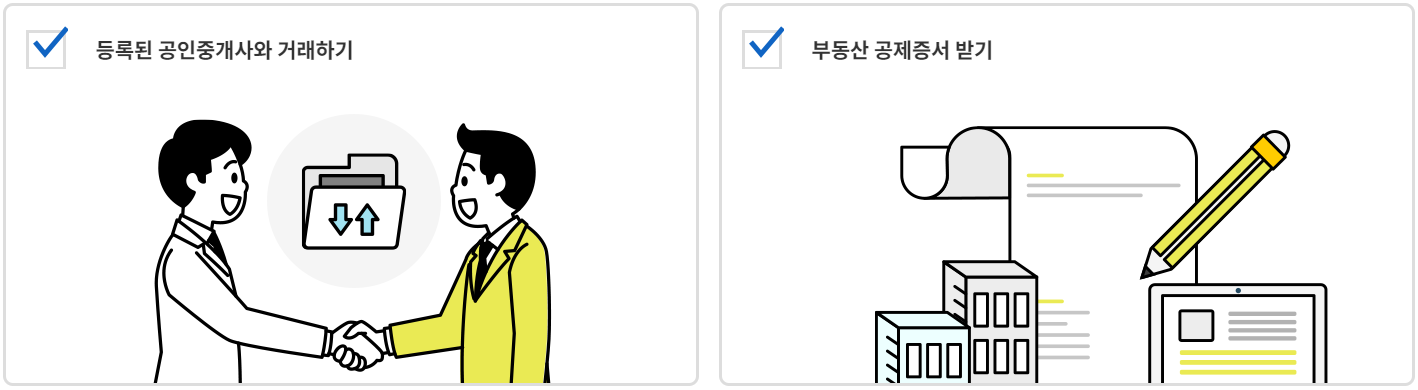 개업 중인 공인중개사는 공인중개사법 제30조에 따라 보증보험이나 공제상품에 가입해야 하는데요. 이에 따라 공인중개사의 과실이나 고의로 계약자가 금전적 피해를 입었을 때 손해를 보증한다는 내용을 담은 '부동산 공제증서'를 발급하게 돼요. 이 공제증서는 실제 중개사고 때문에 벌어진 손해를 배상해줄 때에 쓰이며, 공인중개사가 사기를 벌이지 않겠 다는 다짐이기도 해요. 그러니 중개업등록증과 공인중개사의 신분증을 확인해 꼭 증서를 받을 수 있도록 해요.