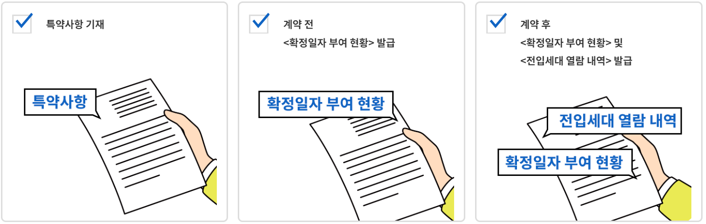 계약 전에는 임대인의 동의서, 임대인의 신분증 사본, 인감증명서 등 필요서류를 챙겨 확정일자 부여 현황 서류를 발급받도록 해요.