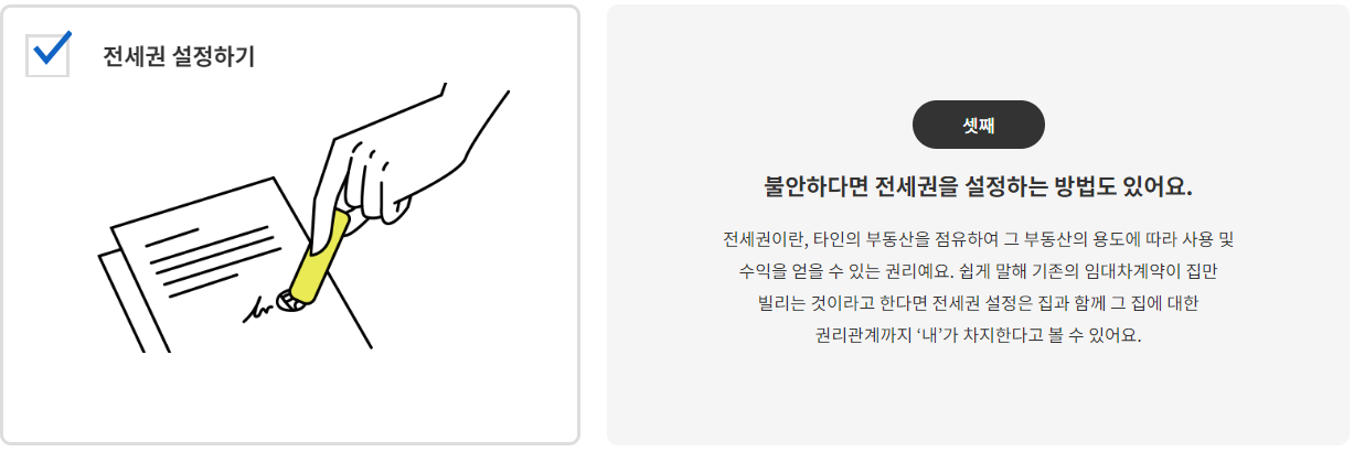 전입신고를 통해 얻은 대항력과 비교해보았을 때 가장 차이가 크다고 할 수 있는 부분은 바로 효력이 발생하는 시점이에요. 전세권은 등기를 통해 실행하기 때문에 등기한 때 부터 효력이 발생하거든요. 또한 전세권을 설정한다면 해당 부동산이 경매에 넘어갔을 경우, 후순위 채권자들보다 전세금을 우선변제받을 수 있어요. 다만 전세권을 설정하기 위해서는 임대인의 동의가 필요하고, 비교적 큰 금액의 비용이 발생할 수 있다는 사실을 꼭 기억하세요. 참고로 전세계약 시작일에 임대인이 변경되는 모든 경우가 위험하지는 않아요. 다만 혹시 있을지 모르는 불상사를 예방하기 위해서는, 새로운 임대인과 옛 임대인의 매매계약서에 임대차계약을 이어받는다는 약속이 포함되는지 확인해야만 해요. 또한 새로운 임대인과 전세계약서를 다시 작성하고 계약서에 확정일자를 받아 주택임대차보호법상의 우선변제권을 갖추어야 해요.