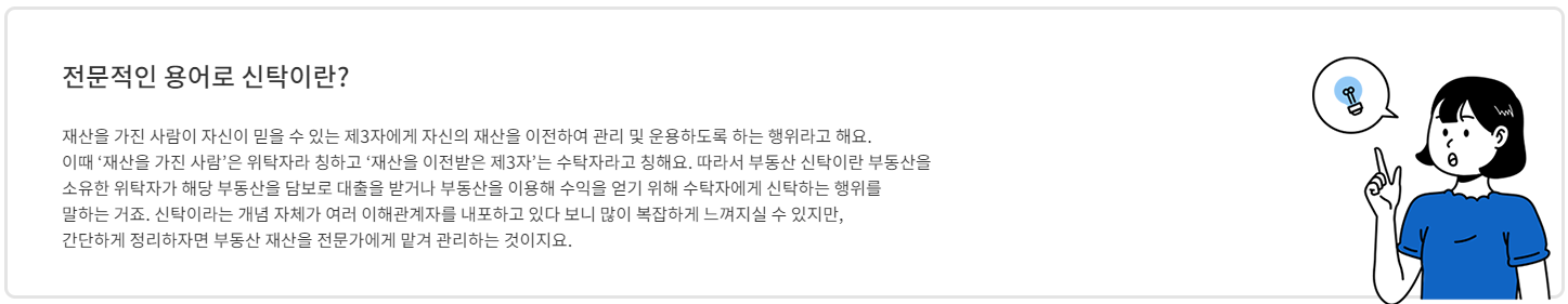 신탁이란, 임대인이 주택을 비롯한 자신의 부동산을 전문가에게 맡기는 걸 의미해요. 임대인은 주택을 담보로 대출을 받을 수도 있고요, 혹은 다른 수익을 얻기 위해서도 신탁을 해요.