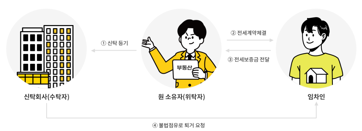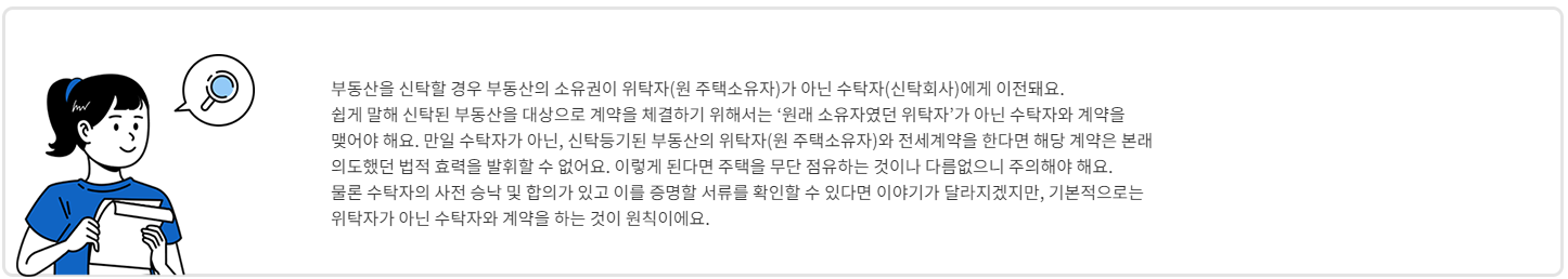 신탁 등기가 된 집은 임대인(=소유주)이 나와 전월세 계약을 하고 싶을 때 반드시 신탁회사의 동의를 받거나, 내가 아예 신탁회사와 계약해야 해요. 왜냐면, 부동산을 신탁할 경우 부동산의 소유권이 신탁회사에게 넘어가거든요. 만약, 신탁회사 동의 없이 계약한다면, 계약 자체가 무효로 취급될 수 있어요. 이렇게 되면, 내가 남의 집을 불법점유하고 있는 것으로 퇴거 요청 받을 수도 있어요. 신탁회사의 사전 승낙 및 합의가 있고 이를 증명할 서류를 확인할 수 있다고 해도, 반드시 전문가의 도움을 통해 절차를 밟거나, 다른 집을 우선적으로 선택하는 것을 추천해요.