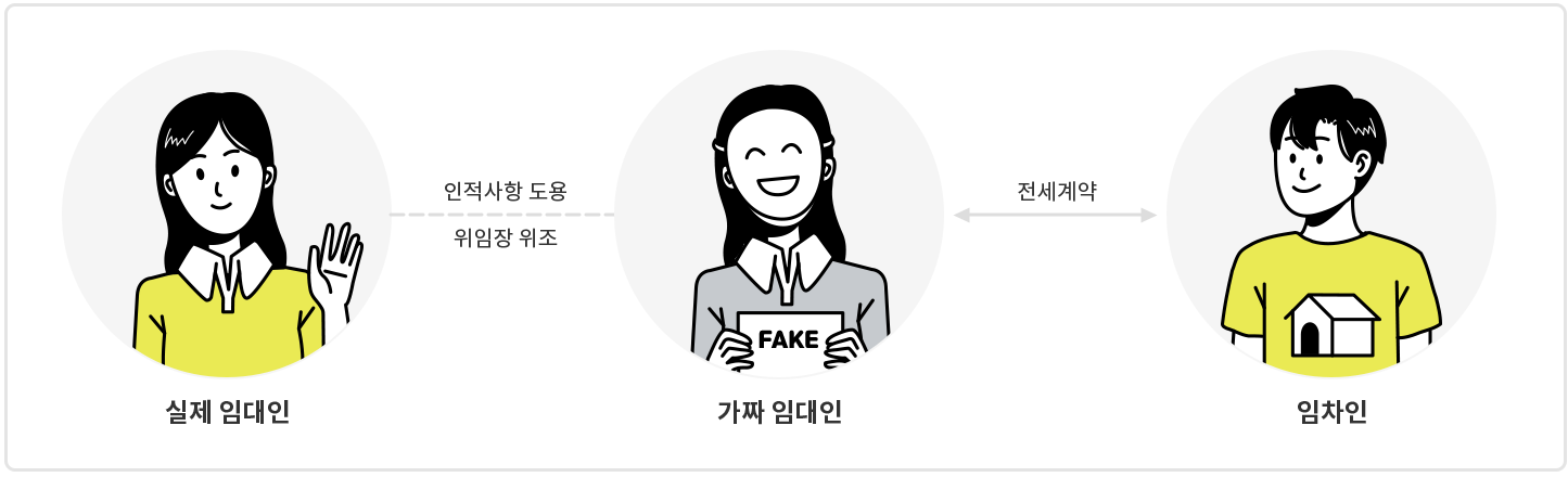 ‘이처럼 임대인이 아닌 사람이 임대인인 척 명의를 도용하는 경우가 심심치 않게 발생해요. ‘가짜 임대인’이 건물을 임대하면서 알아낸 ‘실제 임대인’의 인적사항을 이용하여 자신이 건물주인 척 거짓된 전세계약을 한 후 세입자의 보증금을 가로채는 거죠. 혹은 임대인의 위임장 또는 증명서류를 위조해 대리인 행세를 하면서 세입자의 보증금을 가로채기도 해요.