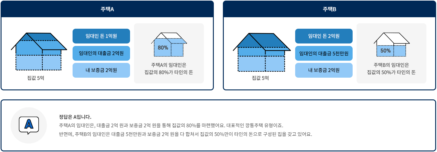 일반적으로 깡통주택은 보증금 + 대출금의 총합이 집값의 80%를 넘는 집을 의미해요. 즉, 임대인이 자기 돈을 얼마나 들여서 집을 갖고 있느냐가 중요해요. 깡통주택의 임대인은 불상사가 생겼을 때 빚 상환을 회피해버릴 수 있기 때문이죠. 그렇기에 깡통주택은 마치 시한폭탄 같은 존재라고 할 수 있어요.