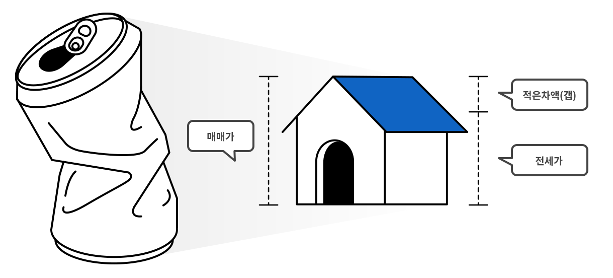 깡통주택이란, 임대인의 집이 경매로 넘어갔을 때, 내 보증금이 떼이게 되는 집을 통틀어 가리켜요. 위 그림처럼 매매가격의 대다수를 세입자의 보증금과 빚으로 채우고 있는 집이어서, 사실상 임대인의 몫은 거의 없는 집들이 흔히 깡통주택이에요.