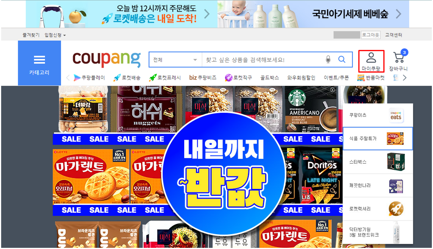 2. 쿠팡사이트 우측 상단에 [마이쿠팡] 메뉴로 들어갑니다.
