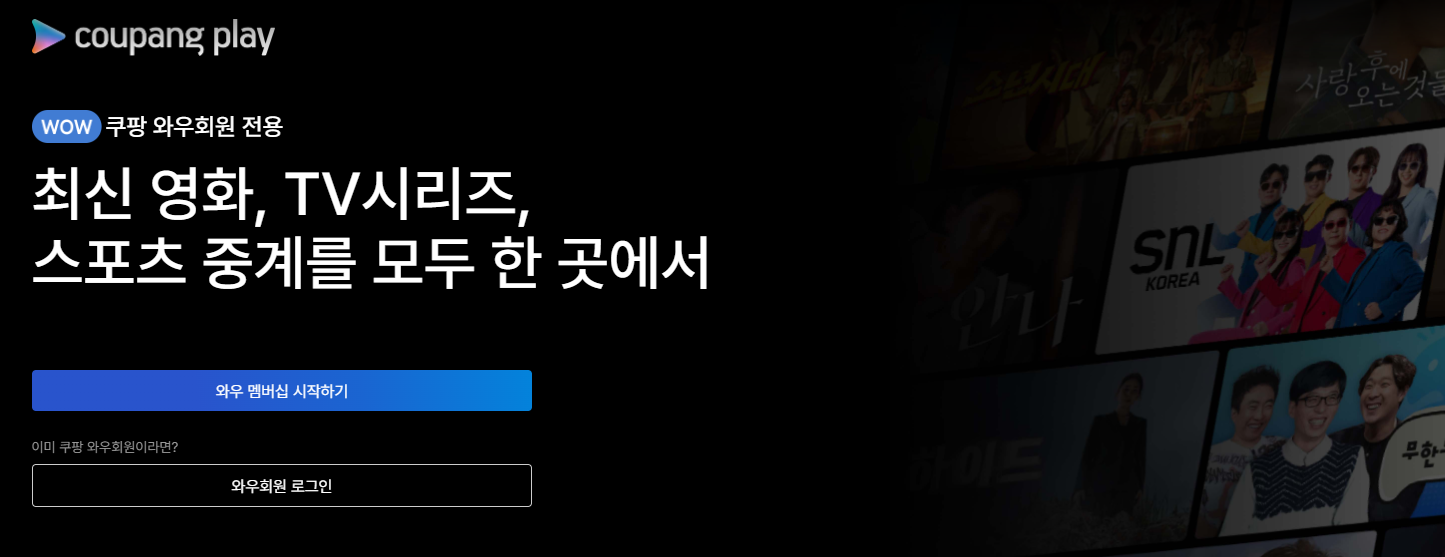 쿠팡플레이는 쿠팡 와우 멤버십 이용자에게만 제공됩니다. 쿠팡 계정으로 로그인하면 자동으로 쿠팡플레이에 연결됩니다.